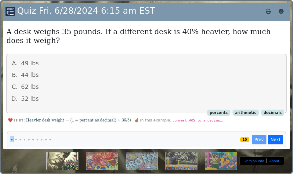 New SHSAT practice quiz ready!6/28/2024Mauk MulderJun 28, 20241Share10 questions (theme = Brooklyn ❤️)Take the QuizSubscribe